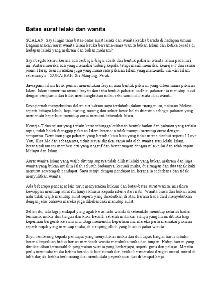 Aurat Lelaki Dan Wanita Shefalitayal from 4.bp.blogspot.com Lelaki hanya perlu menutup aurat di kawasan dari paras pusat hingga ke parasa paha sahaja batas aurat lelaki ketika mengerjakan solat adalah sama juga seperti batas aurat ketika diluar solat, iaitu daripada paras pusat hingga ke paras lutut. Sebagaimana kita ketahui, seseorang yang beragama islam, baik itu lelaki atau perempuan, wajib menutup auratnya. 3.batasan aurat laki laki dan istri. Syaikh abu malik menyanggah pendapat yang berdalil bahwa paha bukan termasuk aurat berdalil dengan hadits di atas, di mana beliau berkata Harus ia melihatnya tetapi tidak harus menyentuhnya. Jika memperlihatkan bagian tubuh di dalam batasan aurat tersebut termasuk perbuatan dosa sebab tidak menjalankan. Aurat sesama lelaki baik dengan kerabat atau orang lain adalah mulai dari pusar hingga lutut. Aurat lelaki dengan wanita jumhur ulama sepakat bahwasanya batasan aurat lelaki dengan wanita mahramnya ataupun yang bukan mahramnya sama dengan batasan aurat sesama lelaki.